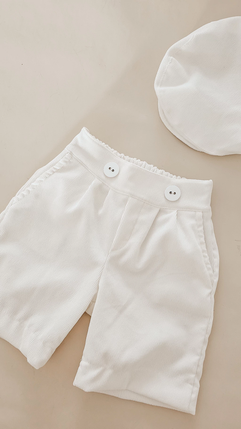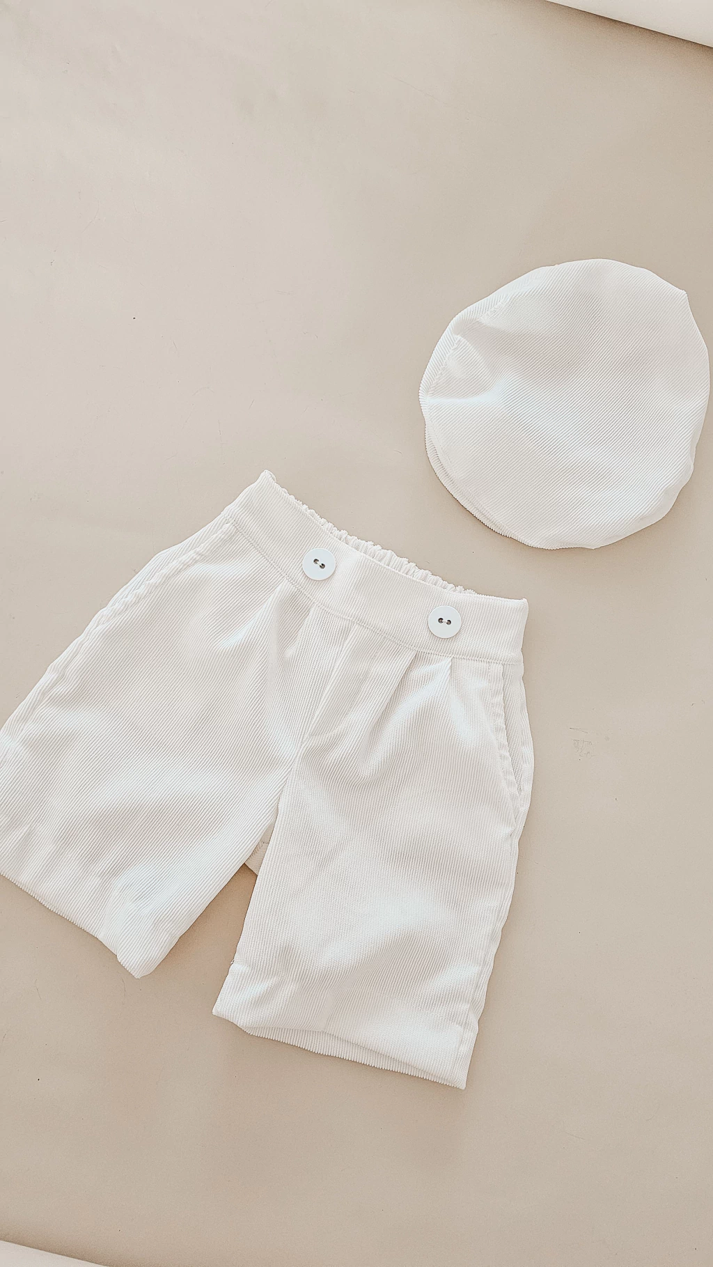 Bermuda e Boina Off White em cotelê são a escolha ideal para meninos nas sessões de fotos, trazendo um visual clássico e sofisticado. O tecido cotelê oferece conforto e textura única, enquanto o tom off white destaca a delicadeza da produção.