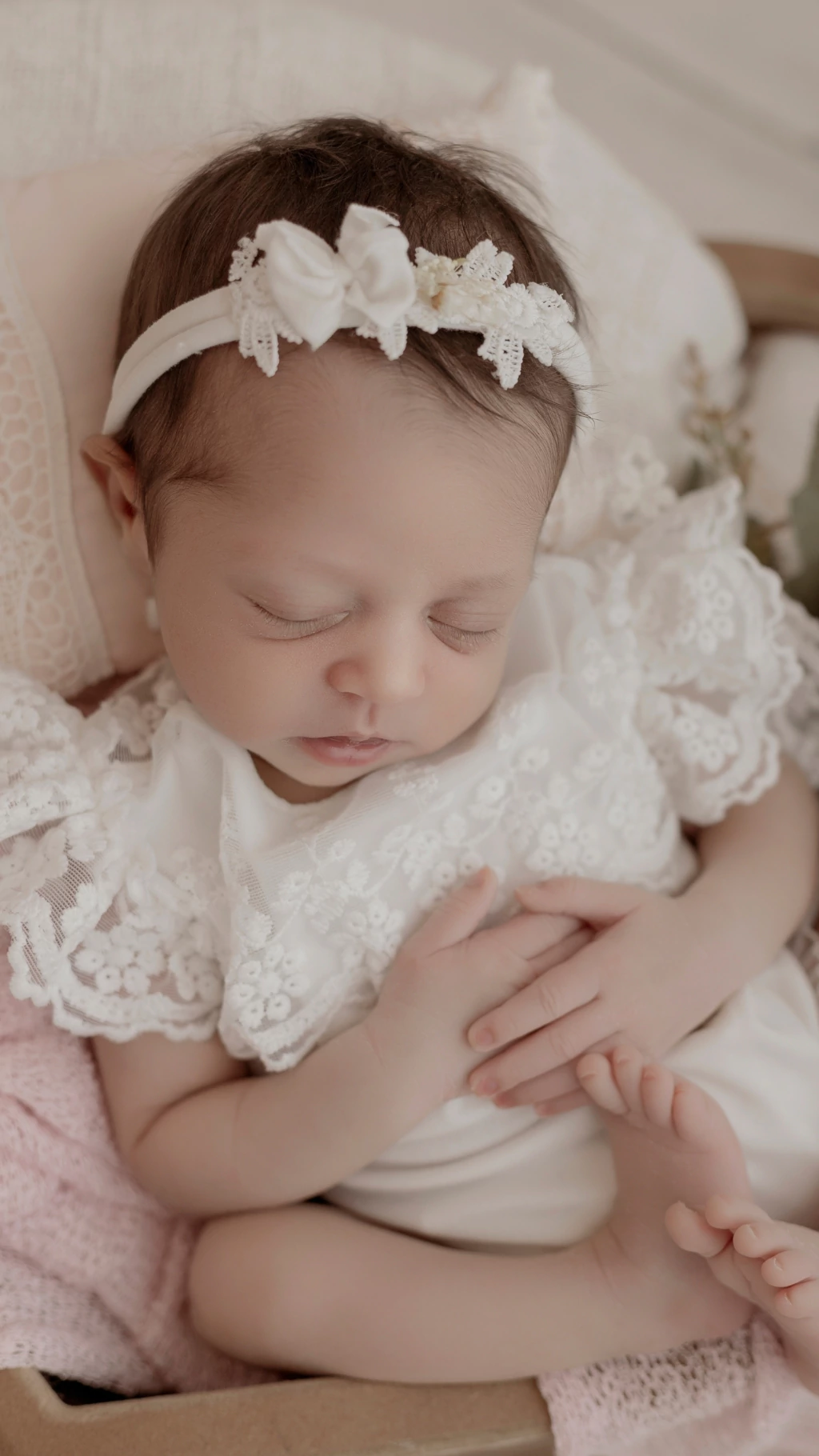 Apresentamos o Body & Headband Lia, o combo perfeito para deixar seu newborn mais fofo que brigadeiro em festa! Todo em renda branca delicada, ele é super confortável e estiloso para as primeiras fotos do seu bebê.