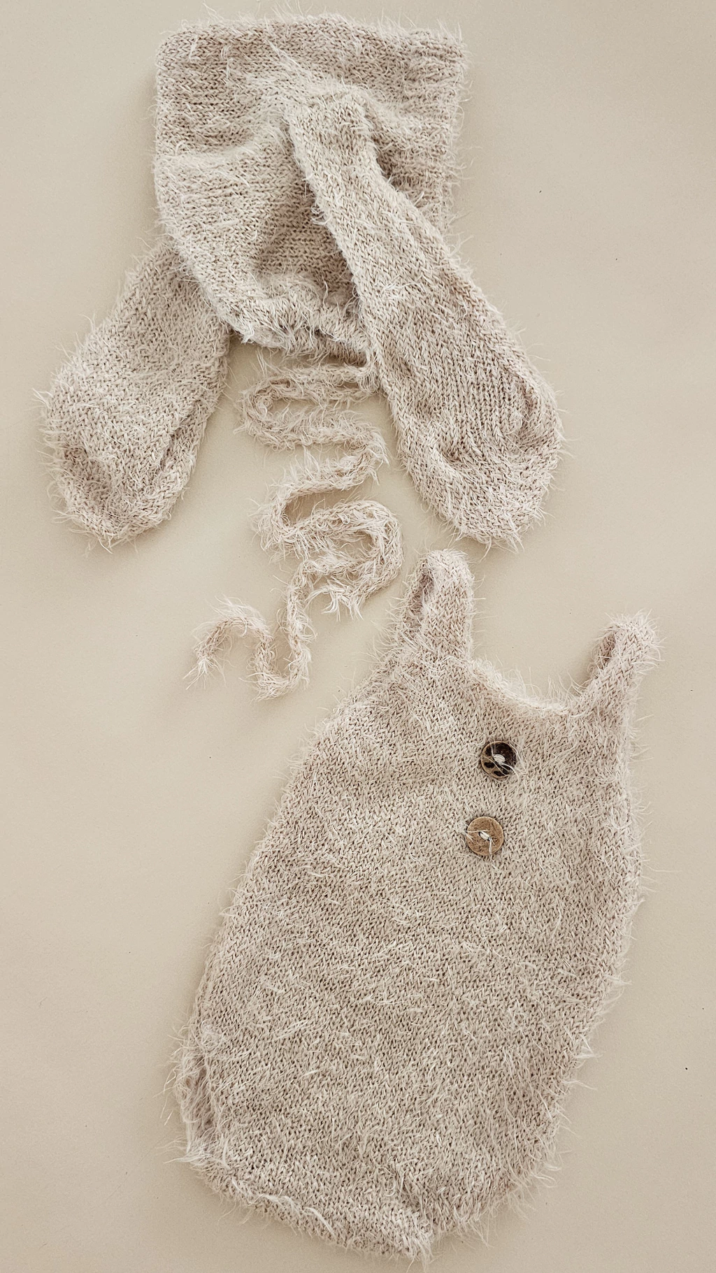 Duas peças compõem esse conjunto: jardineira e touca de coelhinho, ambos feitos com lã Angorá. A marca é o toque macio e suave. Delicado, necessita de lavagem à mão. Leia com atenção a etiqueta para aprender sobre os cuidados com a roupa.