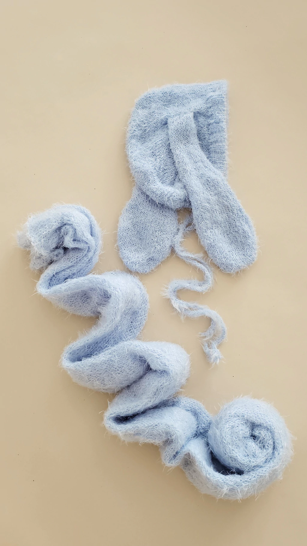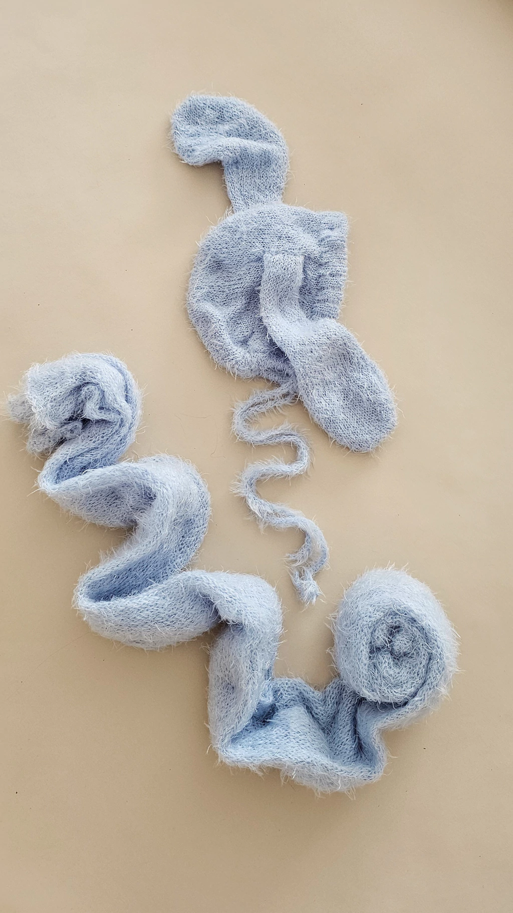 O conjunto é formado por um wrap de tricô e uma touca de tricô, os dois em lã Angorá.