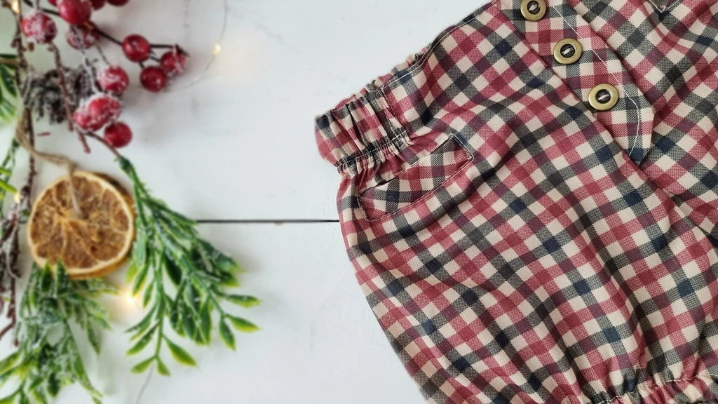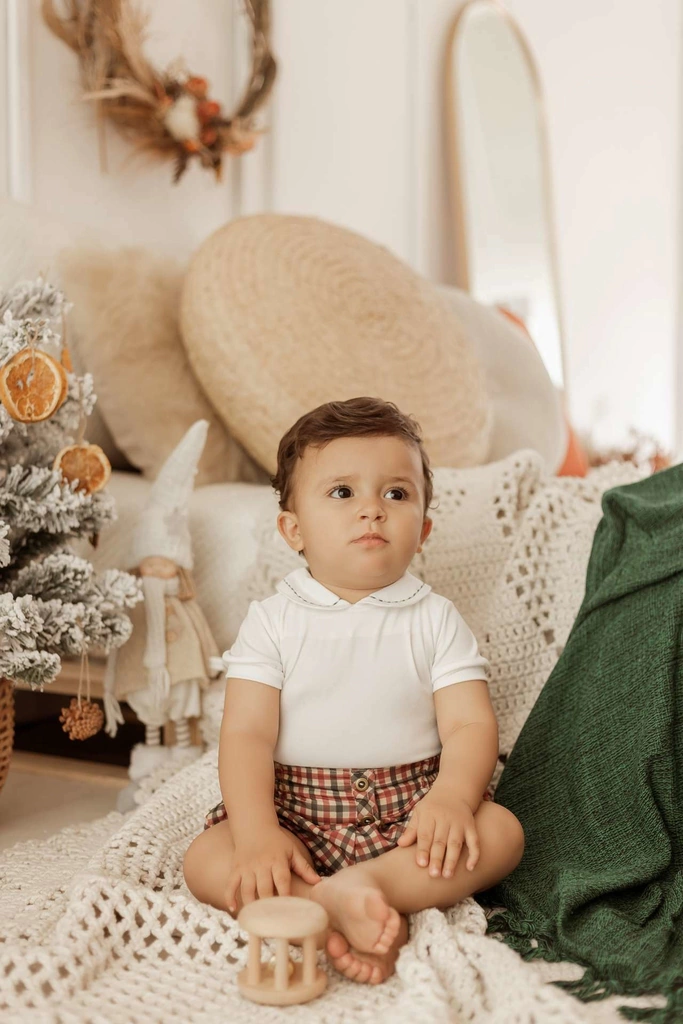Bermuda em tecido xadrez e body com gola bordada, para dar um charme aos nossos bebês. Neste Natal seja luz e leve alegria ao mundo!