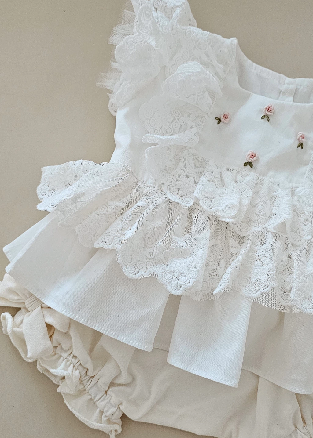Encante-se com o nosso conjunto blusa e tapa fraldas para bebê, adornado com bordados de pequenas flores feitas à mão e detalhes de renda importada. Cada peça é uma verdadeira obra de arte, perfeita para momentos especiais e fotos inesquecíveis!